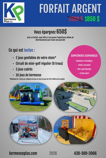 Ne cherchez pas plus loin que Kermesse Plus ! Nos forfaits comprennent tout ce dont vous avez besoin pour créer une expérience inoubliable pour vos invités de tous âges.
